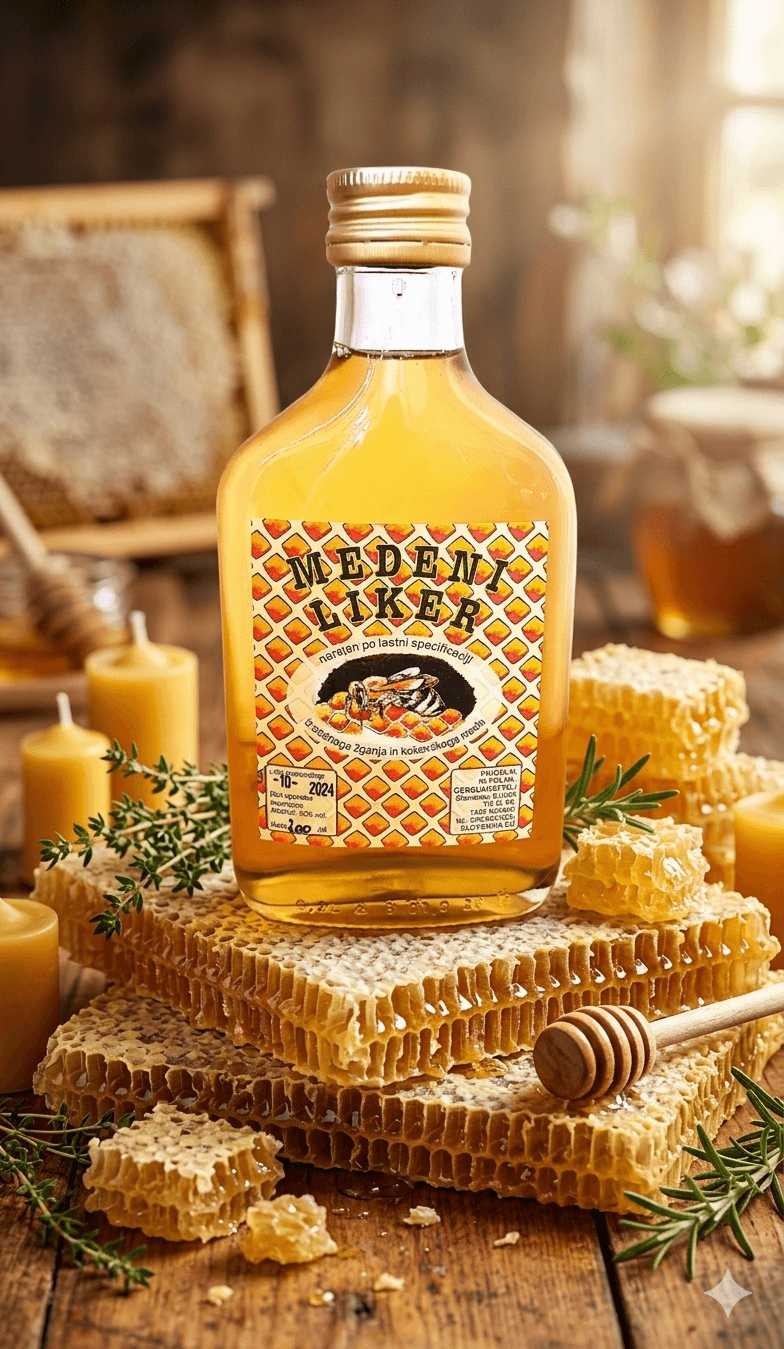 Medeni liker, narejen po lastni specifikaciji iz sadnega žganja in kočevskega medu, prijetnega aromatičnega okusa.
